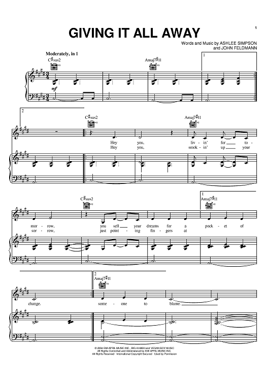 "Giving It All Away" Sheet Music by Ashlee Simpson
