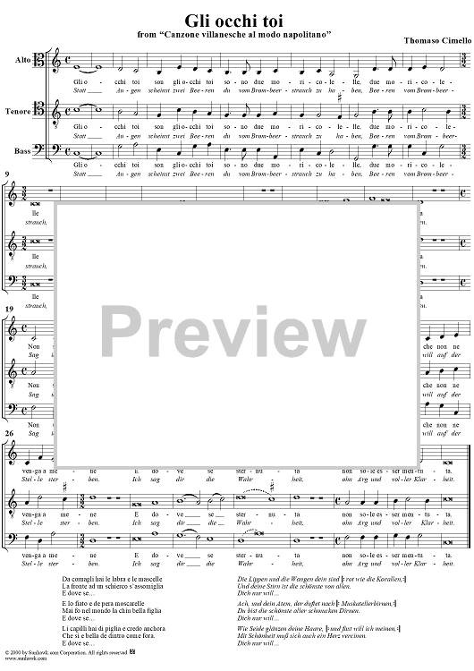 Digital Sheet Music for Gli occhi toi, from "Canzone villanesche al modo napolitano" by Thomas Cimello scored for Three-part Mixed Chorus; id:276830
