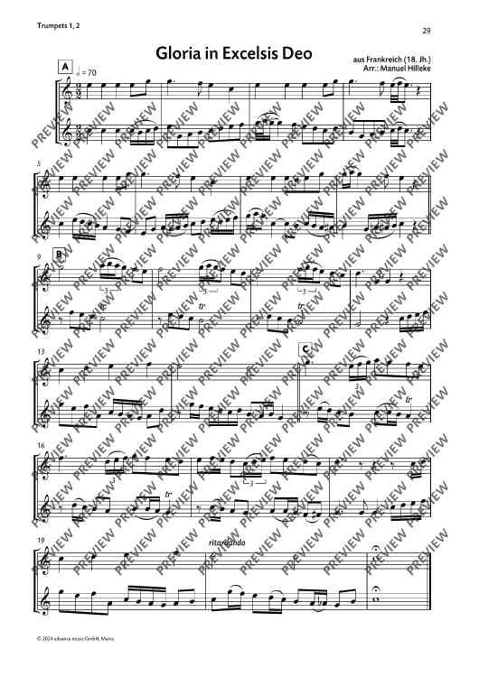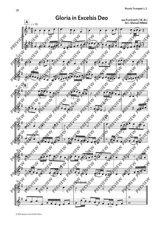 Digital Sheet Music for Gloria In Excelsis Deo by Manuel Hilleke scored for 2 Trumpets Or 2 Piccolo Trumpets; id:510877