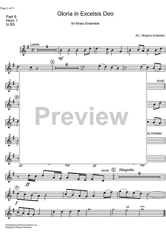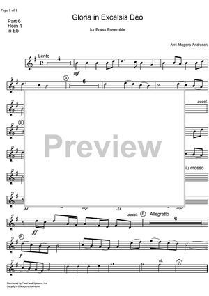 Digital Sheet Music for Gloria in Exelsis Deo - Horn in E-flat by Unknown Writer, Mogens Andresen scored for Brass Ensemble; id:327640