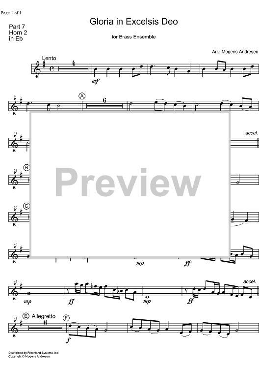 Digital Sheet Music for Gloria in Exelsis Deo - Horn in E-flat by Unknown Writer, Mogens Andresen scored for Brass Ensemble; id:327644