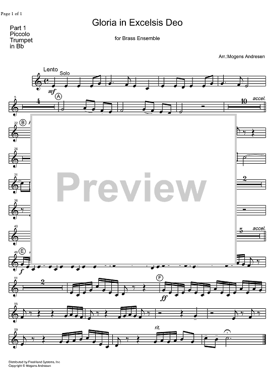 Digital Sheet Music for Gloria in Exelsis Deo - Piccolo Trumpet by Unknown Writer, Mogens Andresen scored for Brass Ensemble; id:327647