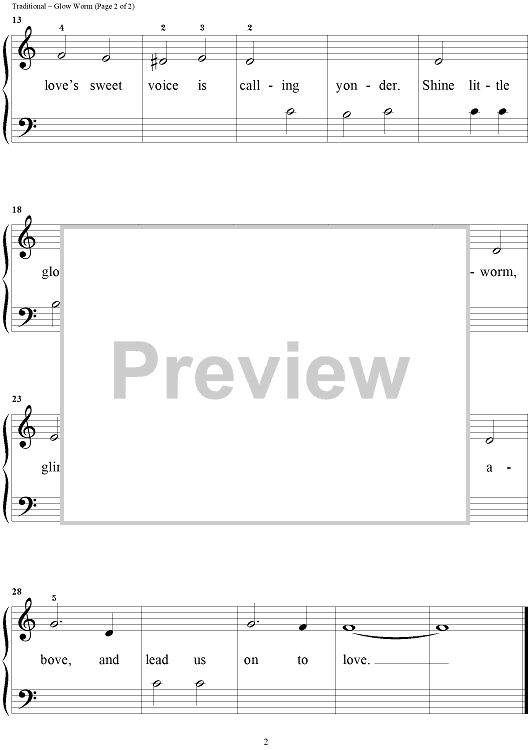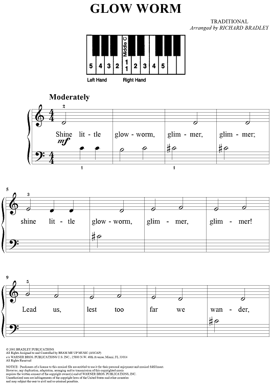 Digital Sheet Music for Glow Worm by Richard Bradley, Traditional scored for Five Finger Piano/Vocal; id:283579