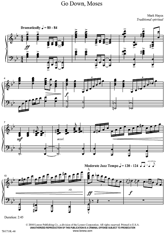 "Go Down, Moses" arranged by Mark hayes. The name "Mark Hayes" has been synonymous with "keyboard artistry" for decades, and his many collections for Lorenz have been consistent best sellers.