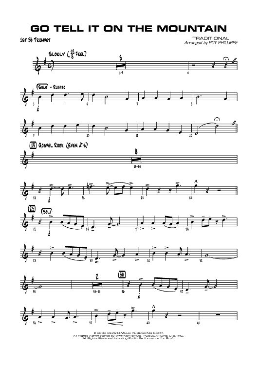 Digital Sheet Music for Go Tell It On the Mountain - B-flat Trumpet 1 by Traditional, Roy Phillippe scored for Jazz Ensemble; id:359584