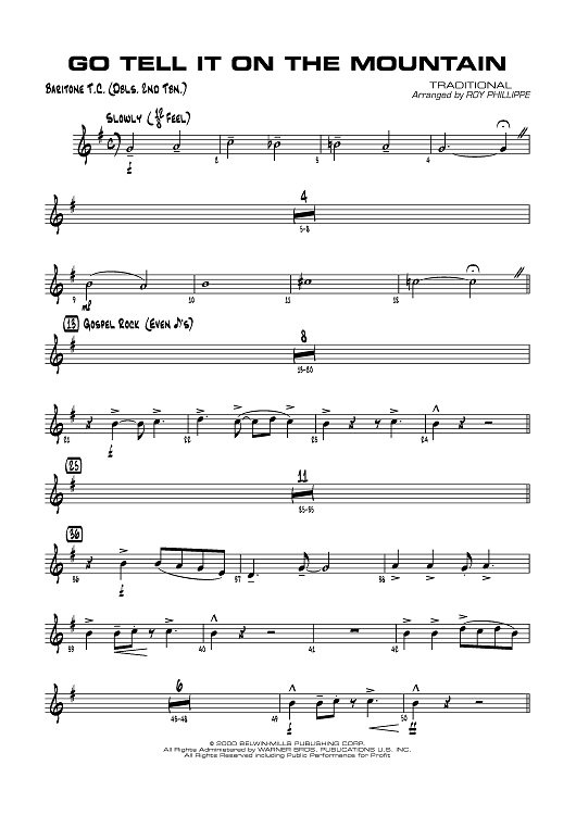 Digital Sheet Music for Go Tell It On the Mountain - Baritone TC by Traditional, Roy Phillippe scored for Jazz Ensemble; id:359600