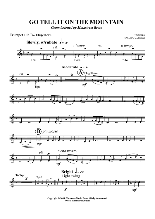 Digital Sheet Music for Go Tell It On The Mountain - Trumpet 1 in B-flat by Traditional, Lewis J. Buckley scored for Brass Quintet; id:409852