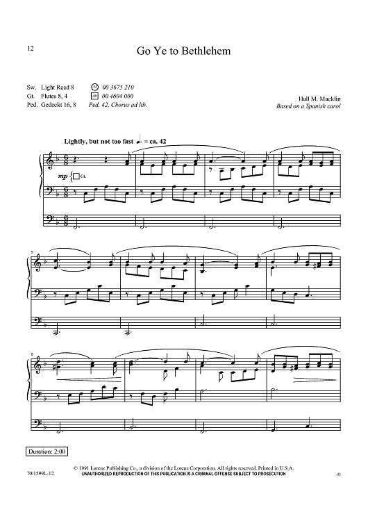 Digital Sheet Music for Go Ye to Bethlehem by Spanish carol, Hall M. Macklin scored for Organ Solo; id:437827