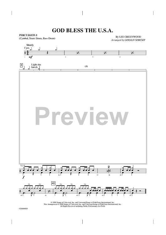 Digital Sheet Music for God Bless the U.S.A. - Percussion 1 by Gerald Sebesky, Lee Greenwood scored for Concert Band; id:310366