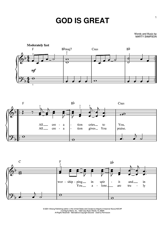 Digital Sheet Music for God Is Great by Marty Sampson scored for Easy Piano; id:402354