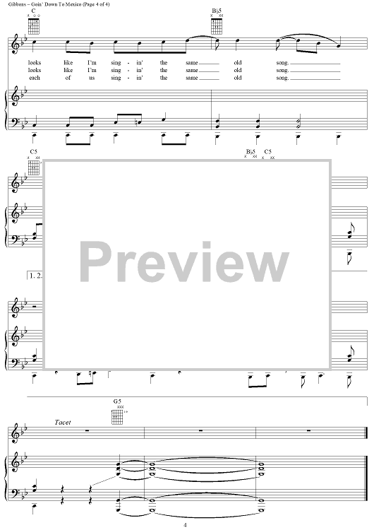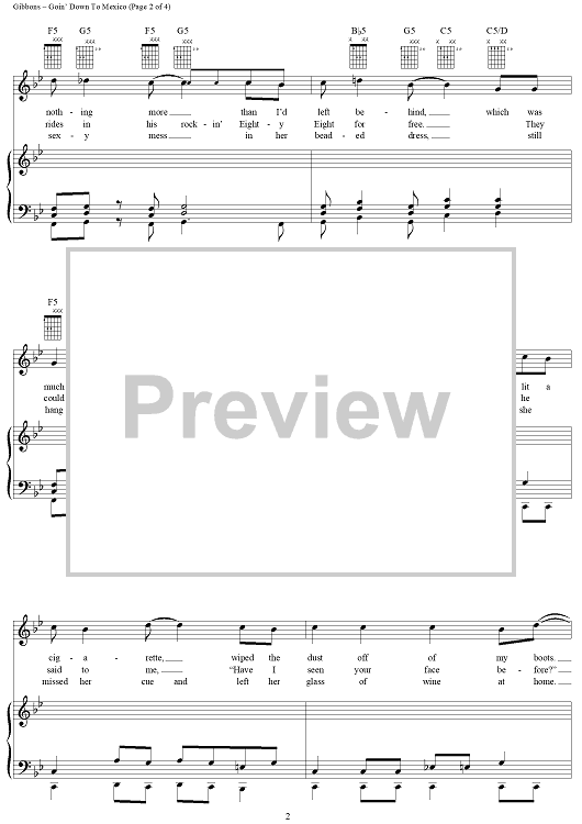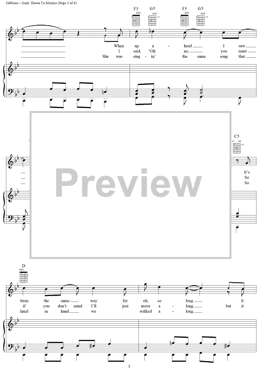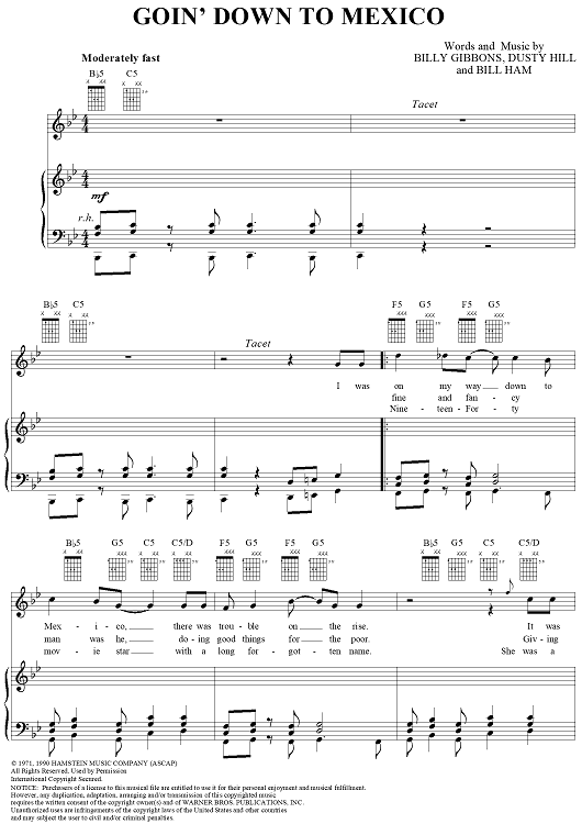 Digital Sheet Music for Goin' Down to Mexico by Billy Gibbons, Dusty Hill, Bill Ham, ZZ Top scored for Piano/Vocal/Chords; id:124309