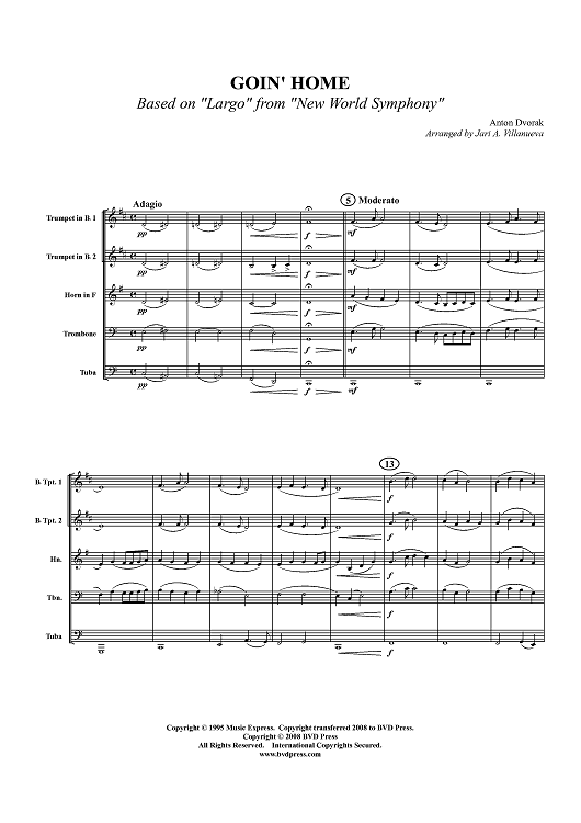 Digital Sheet Music for Goin' Home (based on "Largo" from "New World Symphony" - Score by Antonín Dvorák, Jari Villanueva scored for Brass Quintet; id:405253