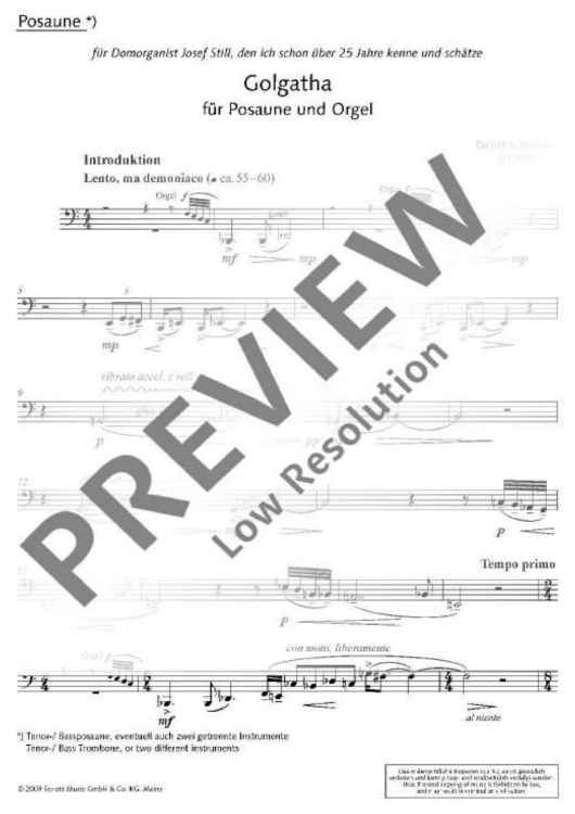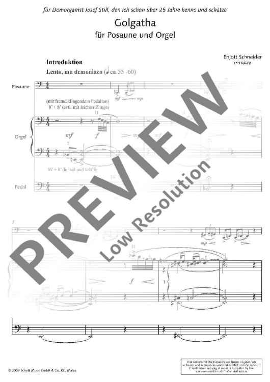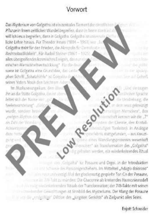 To the composer Enjott Schneider, Golgatha, the biblical place of crucification, is a symbol of both the transient and transcendental in human life. For his composition of the same name, he chose the form of a chaconne with introduction. Full of number symbolism, the work was premiered by the solo trombonist of the Hamburg NDR Symphony Orchestra and the organist of the Trier Cathedral to whom it has been dedicated.