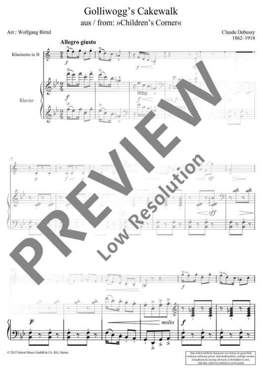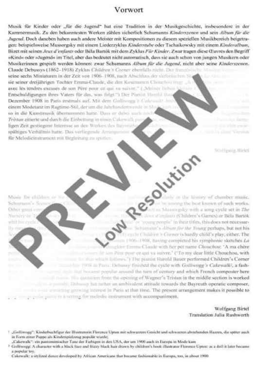 The famous Golliwogg’s Cakewalk is the final piece from Debussy's cycle Children’s Corner which consists of 6 miniatures for piano, written for his daughter in the years 1906-1908. The style corresponds to that of ragtime, a dance which was in vogue around the turn of the century. In the middle section, he parodies several times the beginning of the opera Tristan and Isolde by Richard Wagner with whom Debussy had a rather ambiguous relationship. The present arrangement now allows musicians to play the popular movement in a version for melodic instrument with accompaniment.