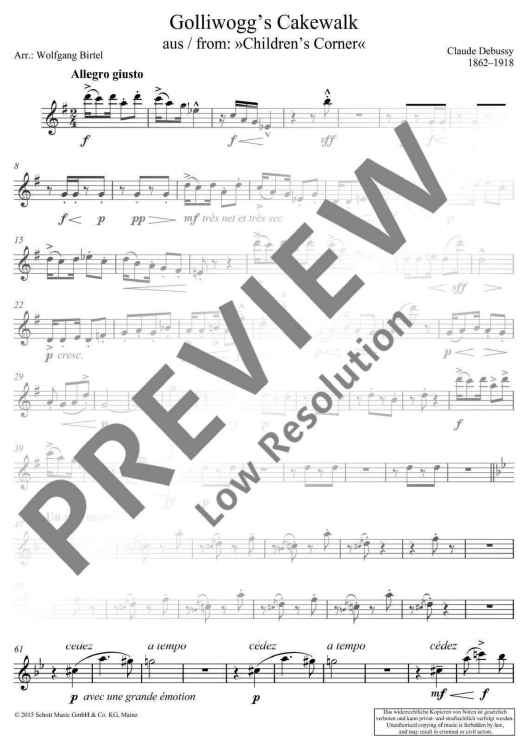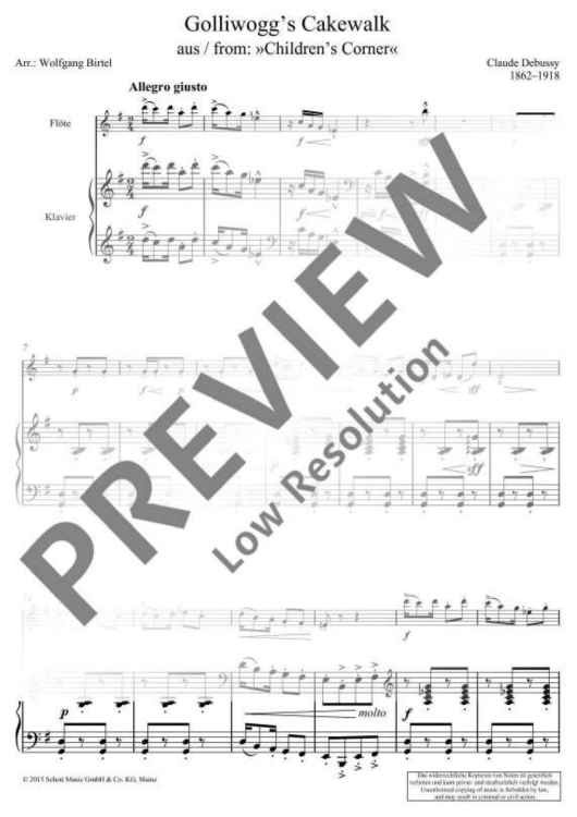 The famous Golliwogg’s Cakewalk is the final piece from Debussy's cycle Children’s Corner which consists of 6 miniatures for piano, written for his daughter in the years 1906-1908. The style corresponds to that of ragtime, a dance which was in vogue around the turn of the century. In the middle section, he parodies several times the beginning of the opera Tristan and Isolde by Richard Wagner with whom Debussy had a rather ambiguous relationship. The present arrangement now allows musicians to play the popular movement in a version for melodic instrument with accompaniment.