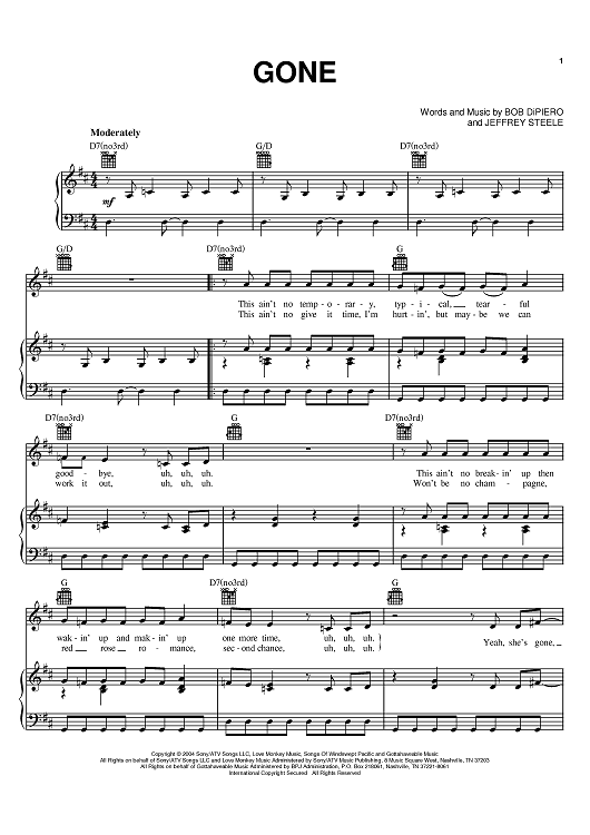 Digital Sheet Music for Gone by Bob DiPiero, Jeffrey Steele, Montgomery Gentry scored for Piano/Vocal/Chords; id:381655