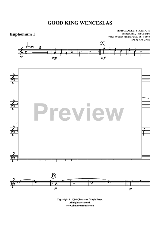 Digital Sheet Music for Good King Wenceslas - Euphonium 1 BC/TC by John Mason Neale, Ron Geese, Spring Carol scored for Tuba Quartet; id:358457