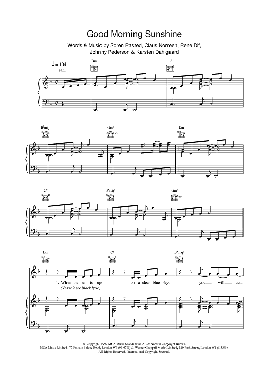 Digital Sheet Music for Good Morning Sunshine by Aqua scored for Piano/Vocal/Chords; id:376630