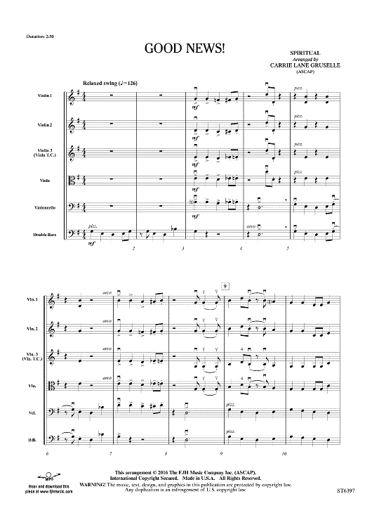 The African-American spiritual Aint-a That Good News! exuberantly expresses joy and hope. Set as a slow swing, plenty of articulations help students achieve the proper style. Basses and cellos experience the walking bass lines and all students will stretch their right hand bowing skills while discovering a number of chromatics in the left hand. (2:30)