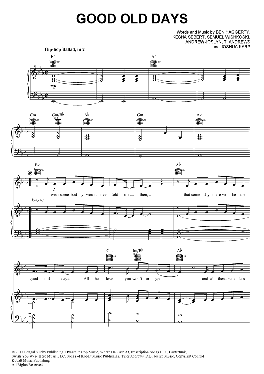 Digital Sheet Music for Good Old Days by Kesha Sebert, Ben Haggerty, Macklemore, Andrew Joslyn, Semuel Wishkoski, T. Andrews, Joshua Karp scored for Piano/Vocal/Chords; id:465651