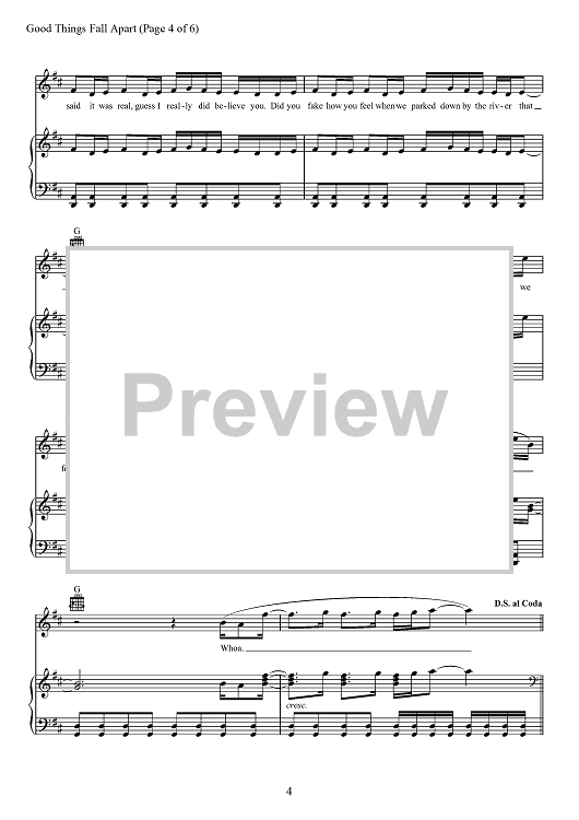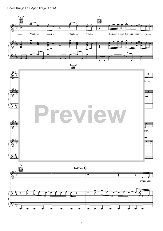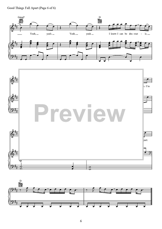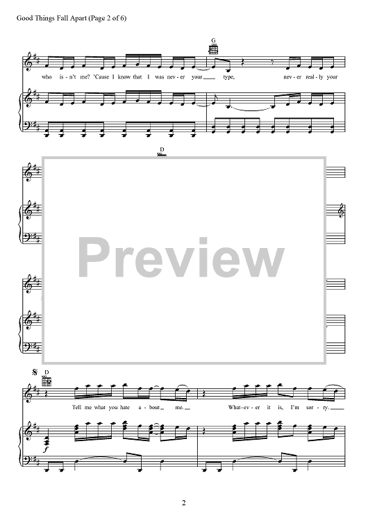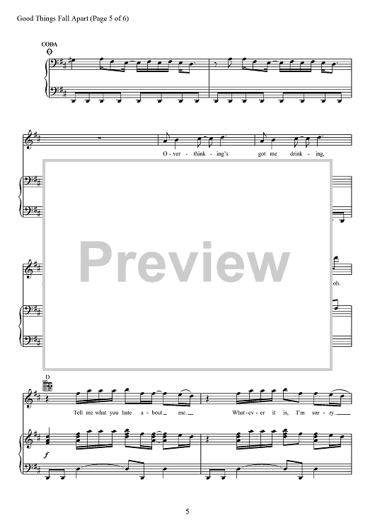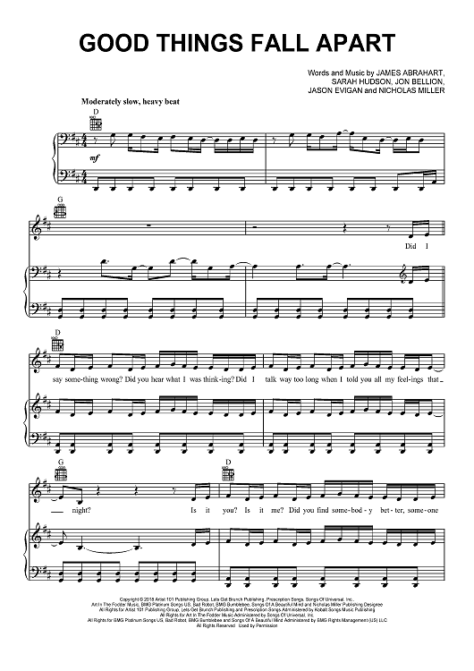 Digital Sheet Music for Good Things Fall Apart by Jason Evigan, Sarah Hudson, James Abrahart, Jon Bellion, Illenium, Nicholas Miller scored for Piano/Vocal/Chords; id:467730