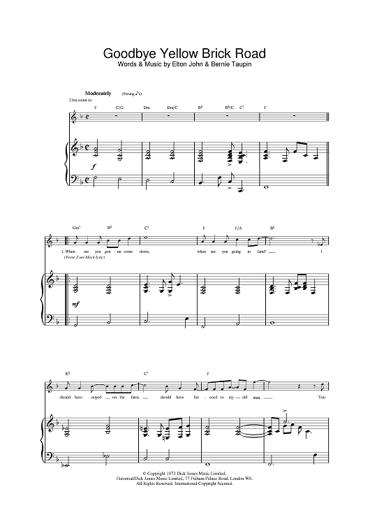 Digital Sheet Music for Goodbye Yellow Brick Road by Elton John, Bernie Taupin scored for Piano/Vocal/Chords; id:385672