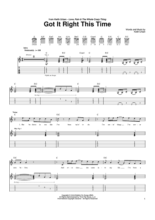 Digital Sheet Music for Got It Right This Time by Keith Urban scored for Guitar Tab; id:402468