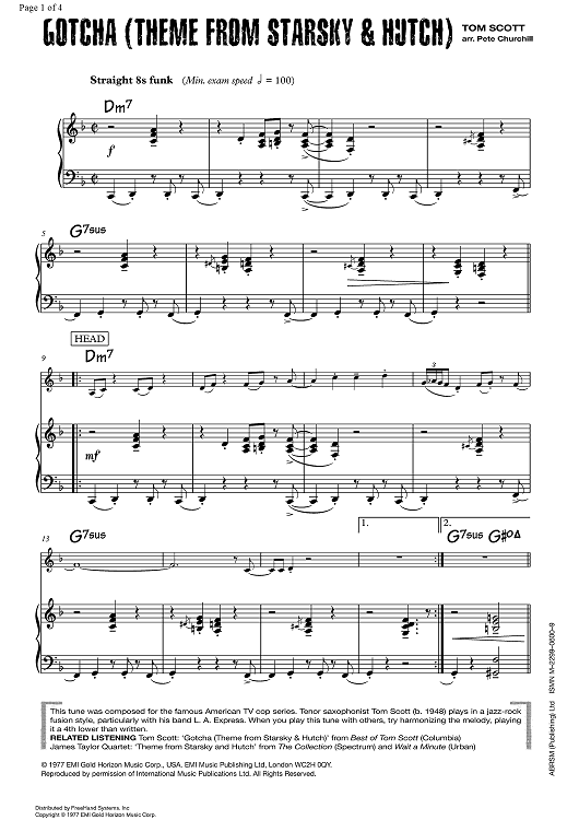 Digital Sheet Music for Gotcha (Theme from Starsky & Hutch) by Tom Scott, Pete Churchill scored for Saxophone/Piano; id:355507
