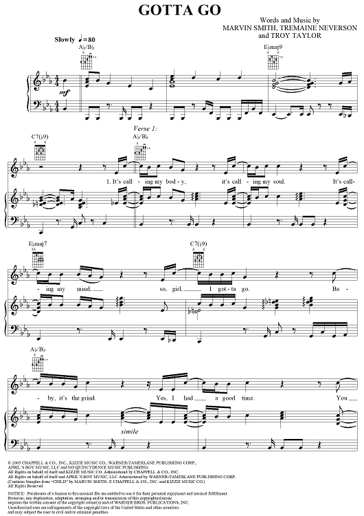 Digital Sheet Music for Gotta Go by Troy Taylor, Marvin Smith, Tremaine Neverson, Trey Songz scored for Piano/Vocal/Chords; id:321592