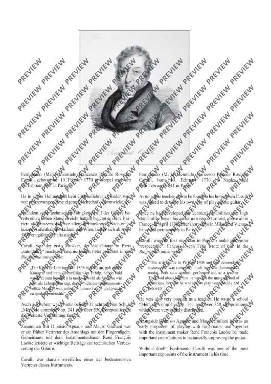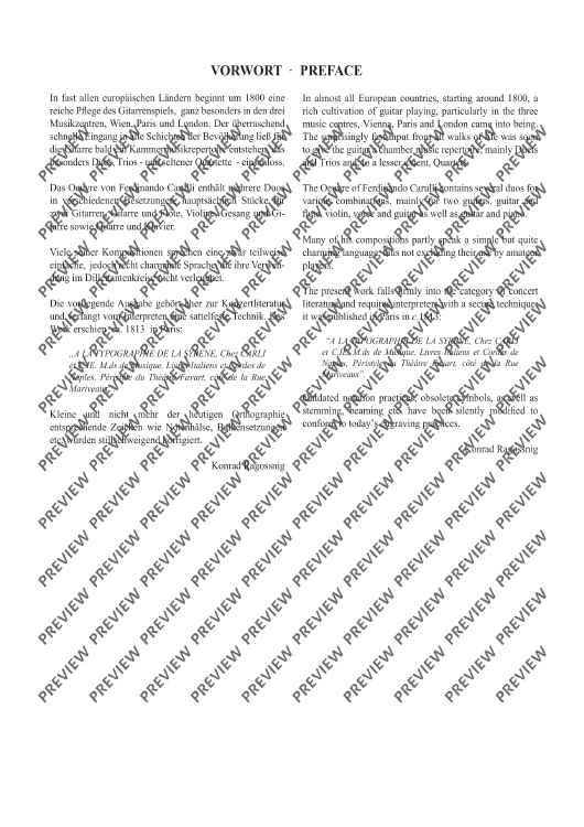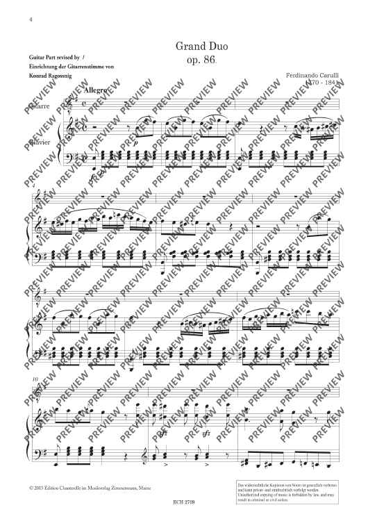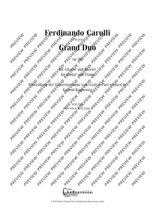 Carulli's music generally speaks a simple but charming language. The Grand Duo Opus 86 for guitar and piano is a strong concert work and a valuable and substantial addition to the guitar repertoire. Although it requires a secure technique, it is suitable for players of moderate ability. This edition is edited by the renowned Austrian guitarist Konrad Ragossnig. Ferdinando Carulli (1770 Naples - 1841 Paris) was self taught and established himself in Paris in 1813, where he enjoyed tremendous success both as a teacher and a concert soloist. He composed some 350 works, including many for duos and trios; his guitar method op. 241 is still in use today.