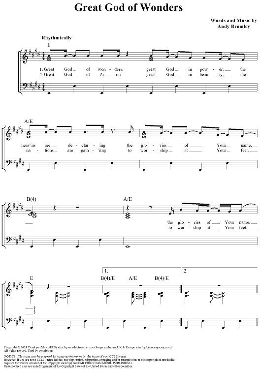Digital Sheet Music for Great God of Wonders by Andy Bromley scored for Piano/Vocal/Chords; id:321380