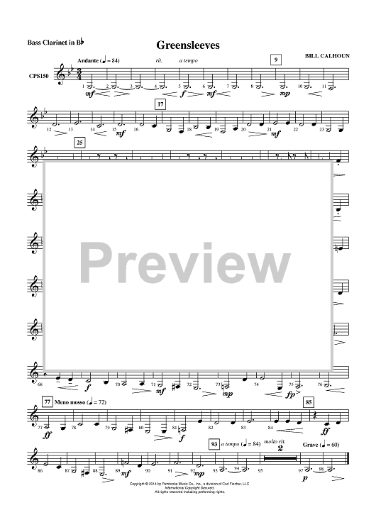 Digital Sheet Music for Greensleeves - Bass Clarinet in Bb by Bill Calhoun scored for Concert Band; id:450925