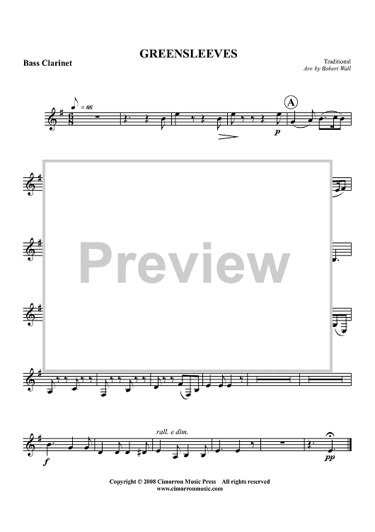 Digital Sheet Music for Greensleeves - Bass Clarinet by Traditional, Robert Wall scored for Woodwind Ensemble; id:416558