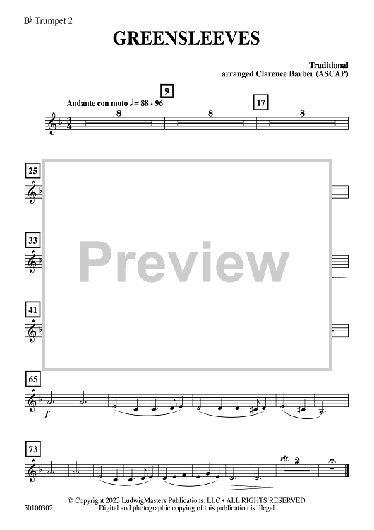 Digital Sheet Music for Greensleeves - Bb Trumpet 2 by Traditional, Clarence Barber scored for Concert Band; id:509154