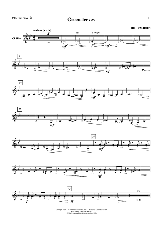 "Greensleeves - Clarinet 3 in Bb" Sheet Music by Bill Calhoun