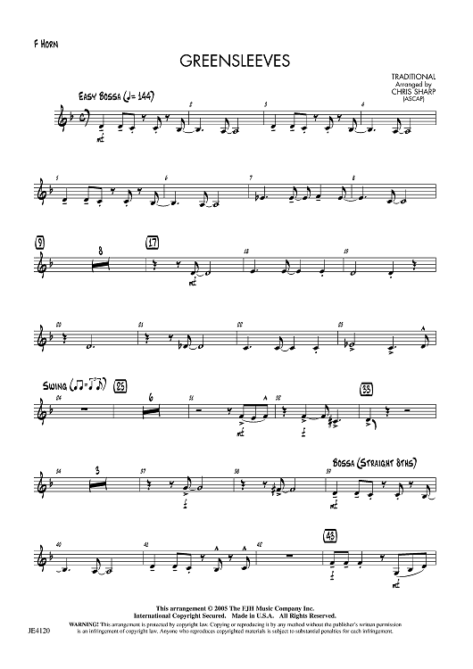 Digital Sheet Music for Greensleeves - F Horn by Traditional, Chris Sharp scored for Jazz Ensemble; id:456038