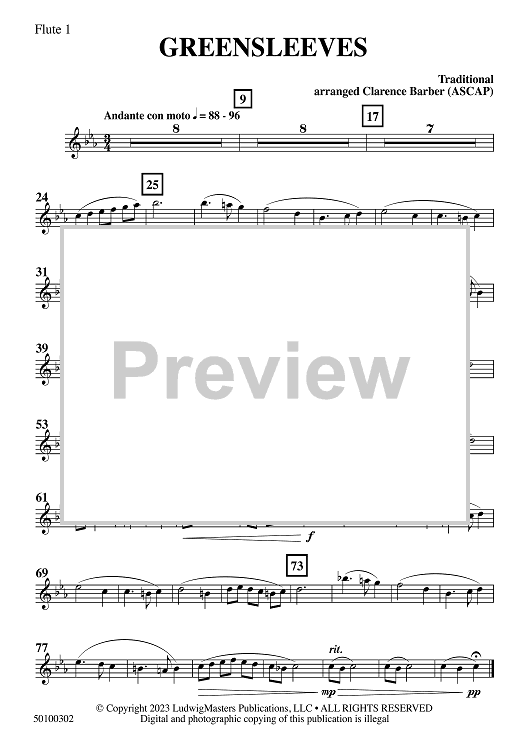 Digital Sheet Music for Greensleeves - Flute 1 by Traditional, Clarence Barber scored for Concert Band; id:509142