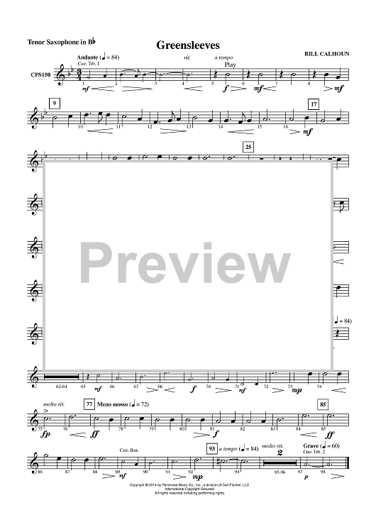 Digital Sheet Music for Greensleeves - Tenor Sax by Bill Calhoun scored for Concert Band; id:450929