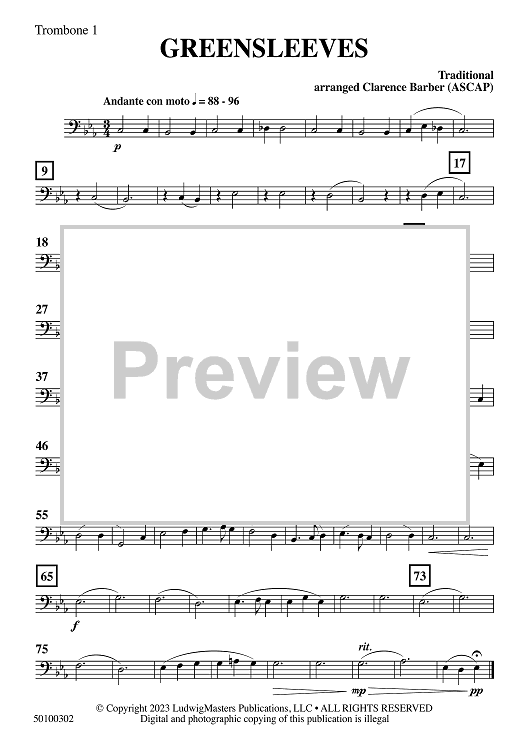 Digital Sheet Music for Greensleeves - Trombone 1 by Traditional, Clarence Barber scored for Concert Band; id:509156