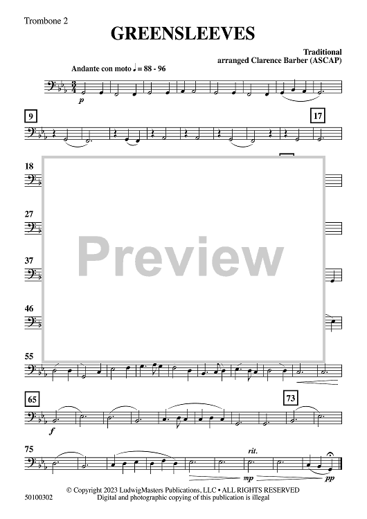 Digital Sheet Music for Greensleeves - Trombone 2 by Traditional, Clarence Barber scored for Concert Band; id:509157