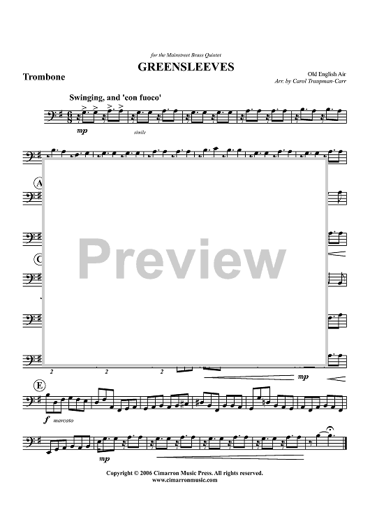 Digital Sheet Music for Greensleeves - Trombone by , Old English Air, Carol Traupman-Carr scored for Brass Quintet; id:356480
