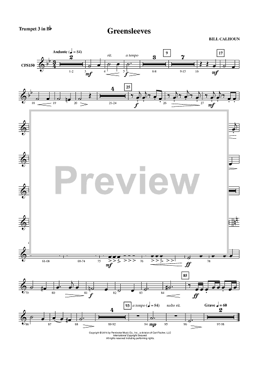 Digital Sheet Music for Greensleeves - Trumpet 3 in Bb by Bill Calhoun scored for Concert Band; id:450933