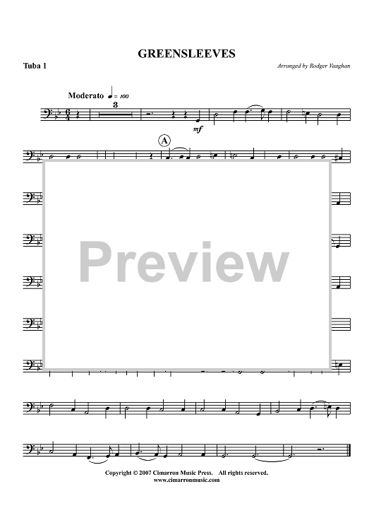 Digital Sheet Music for Greensleeves - Tuba 1 by Rodger Vaughan, Traditional scored for Tuba Quartet; id:413582