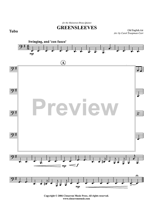 Digital Sheet Music for Greensleeves - Tuba by , Old English Air, Carol Traupman-Carr scored for Brass Quintet; id:356481