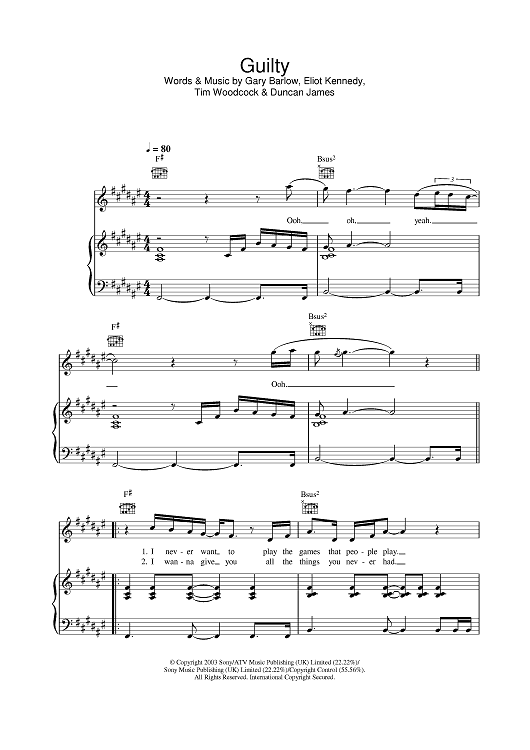 Digital Sheet Music for Guilty by Gary Barlow, Eliot Kennedy, Blue, Tim Woodcock, Duncan James scored for Piano/Vocal/Chords; id:378169