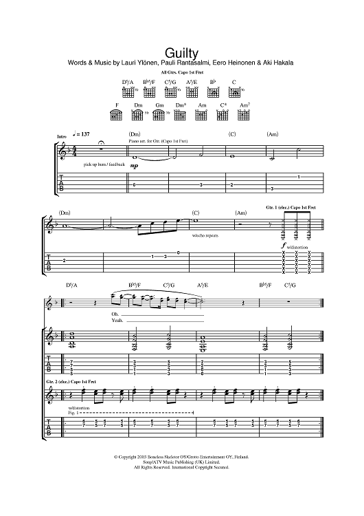 Digital Sheet Music for Guilty by Eero Heinonen, Pauli Rantasalmi, The Rasmus, Lintu scored for Guitar Tab; id:382938