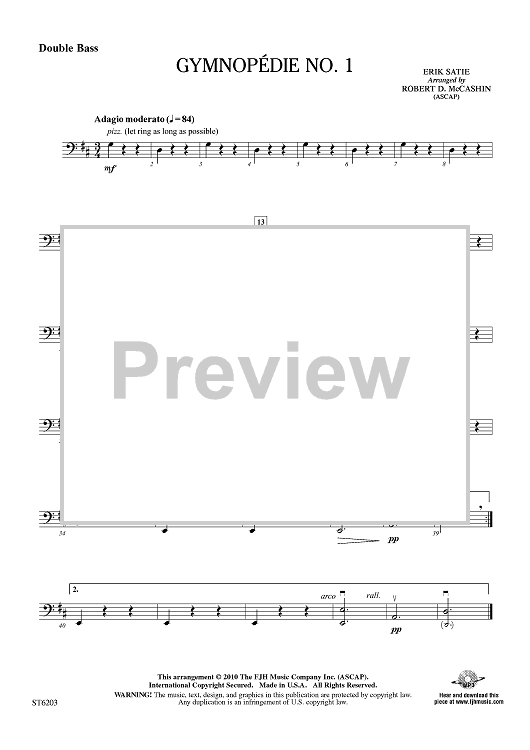 Digital Sheet Music for Gymnopédie No. 1 - Double Bass by Erik Satie, Robert D. McCashin scored for Orchestra; id:411500