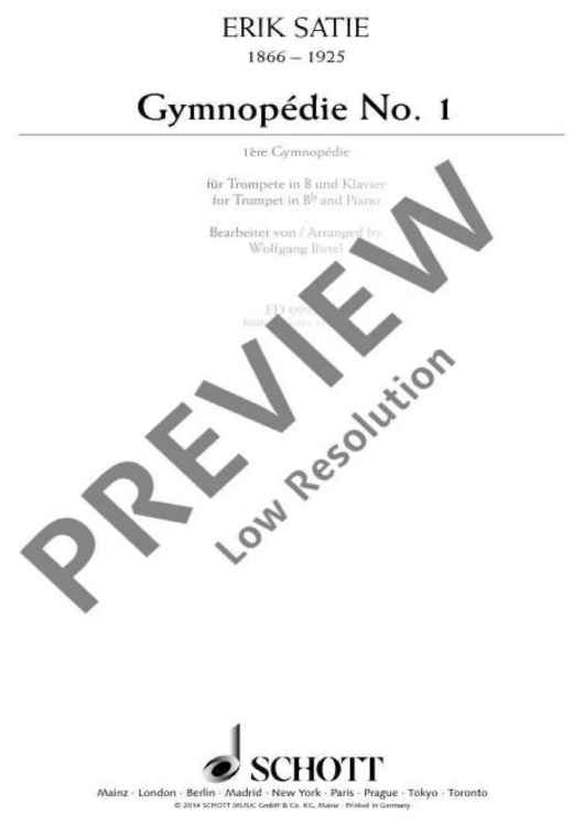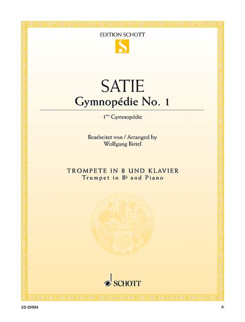 The music scene took notice of Erik Satie (1866-1925) all of a sudden: The world premiere of his ballet 'Parade' on 18 May 1917 caused quite a scandal. The production which involved Sergey Diaghilev with his 'Ballets Russes', Pablo Picasso (scenery and costumes), Jean Cocteau (story) as well as Léonide Massine (choreography) divided the music scene of Paris, yet made the composer widely known. Satie who hardly had had any solid musical training and lived in Paris for almost all his life developed a new musical style, in deliberate rejection of the 'Wagnérisme' of his time. Classical form models, new harmonies, stylistic ease, meditative and clownish elements amalgamated in an original way, the perfect example being his '3 Gymnopédies' of 1888 the first of which was here arranged for a solo instrument with piano accompaniment: Thus, it is now possible, even for non-pianists, to play this famous miniature by Satie. Thanks to its easy playability, it can also be used for educational purposes.