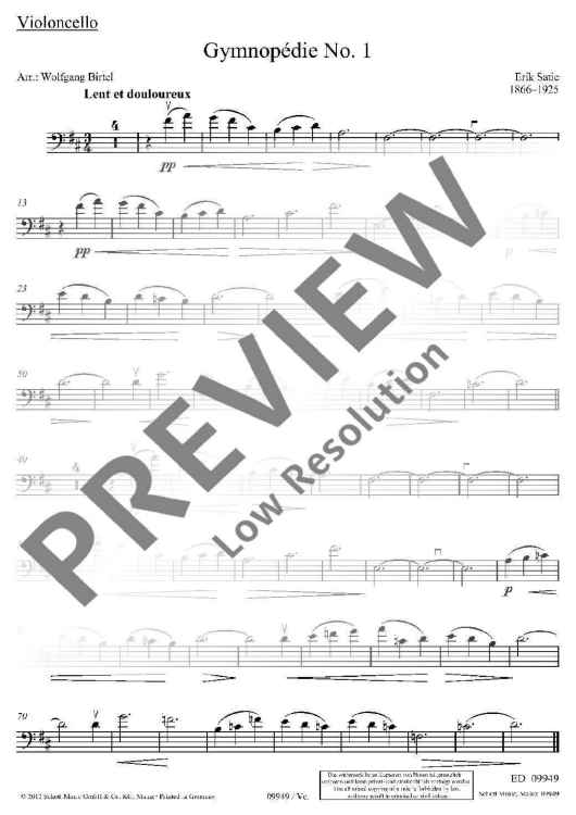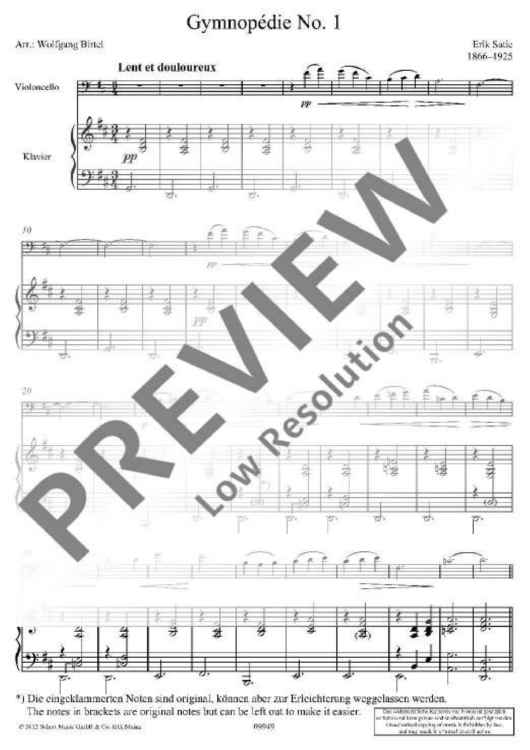 The music scene took notice of Erik Satie (1866-1925) all of a sudden: The world premiere of his ballet 'Parade' on 18 May 1917 [siehe dt. Text!] caused quite a scandal. The production which involved Sergey Diaghilev with his 'Ballets Russes', Pablo Picasso (scenery and costumes), Jean Cocteau (story) as well as Léonide Massine (choreography) divided the music scene of Paris, yet made the composer widely known. Satie who hardly had had any solid musical training and lived in Paris for almost all his life developed a new musical style, in deliberate rejection of the 'Wagnérisme' of his time. Classical form models, new harmonies, stylistic ease, meditative and clownish elements amalgamated in an original way, the perfect example being his '3 Gymnopédies' of 1888 the first of which was here arranged for a solo instrument with piano accompaniment: Thus, it is now possible, even for non-pianists, to play this famous miniature by Satie. Thanks to its easy playability, it can also be used for educational purposes.