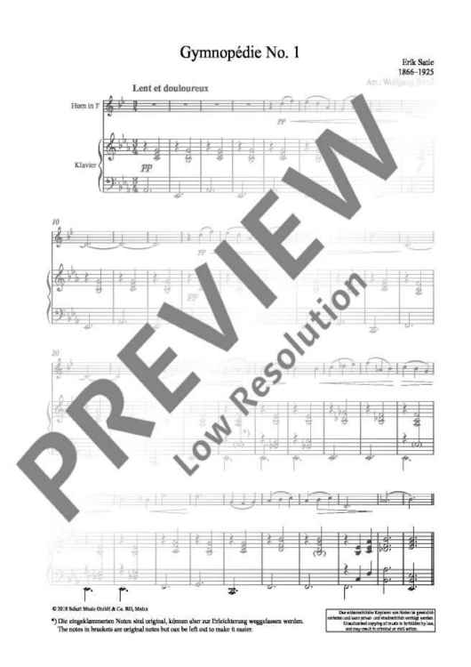 The music scene took notice of Erik Satie all of a sudden: The world premiere of his ballet 'Parade' in 1917 caused quite a scandal. The production divided the music scene of Paris, yet made the composer widely known. Satie who hardly had had any solid musical training developed a new musical style, in deliberate rejection of the 'Wagnérisme' of his time, the perfect example being his '3 Gymnopédies' of 1888 the first of which was here arranged for a solo instrument with piano accompaniment: Thanks to its easy playability, it can also be used for educational purposes.